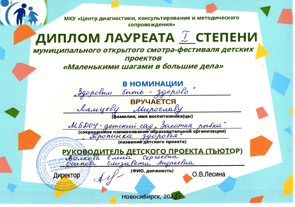 Диплом лауреата 1 степени за участие в фестивале "Маленькими шагами в большие дела!
