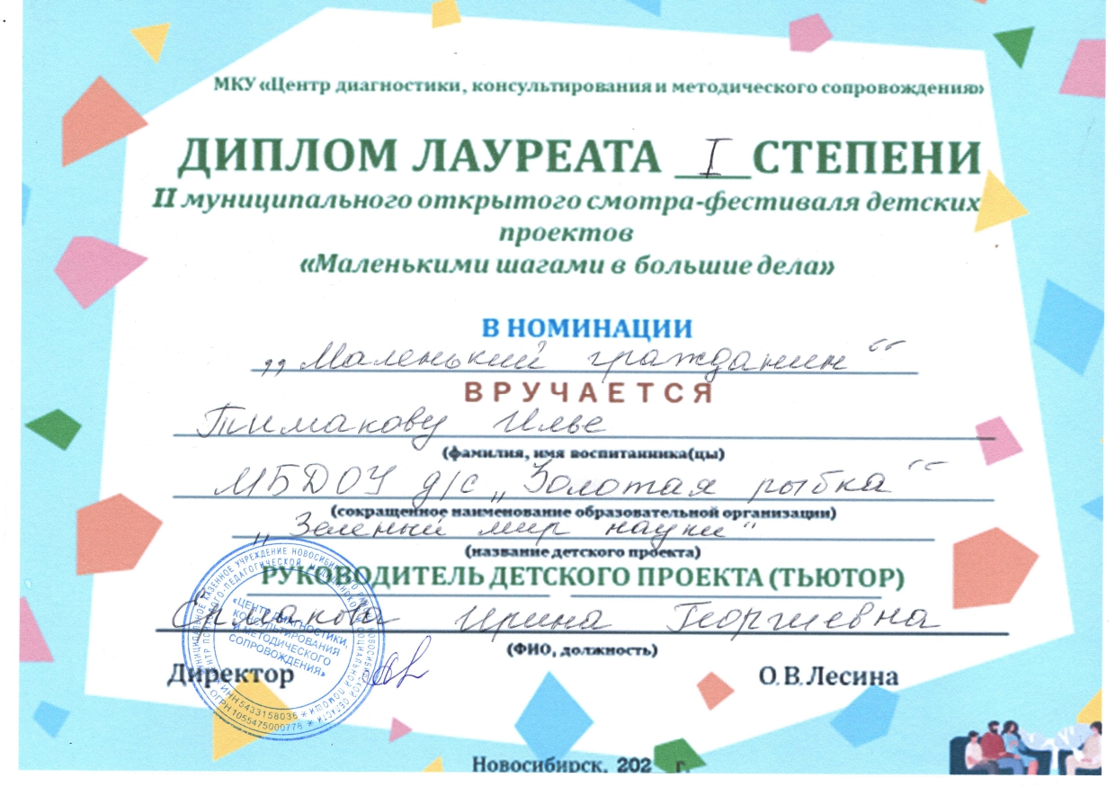 Диплом победителя первого этапа регионального конкурса "Лучшая методическая разработка по краеведческому образованию детей дошкольного возраста в НСО" 2023 год